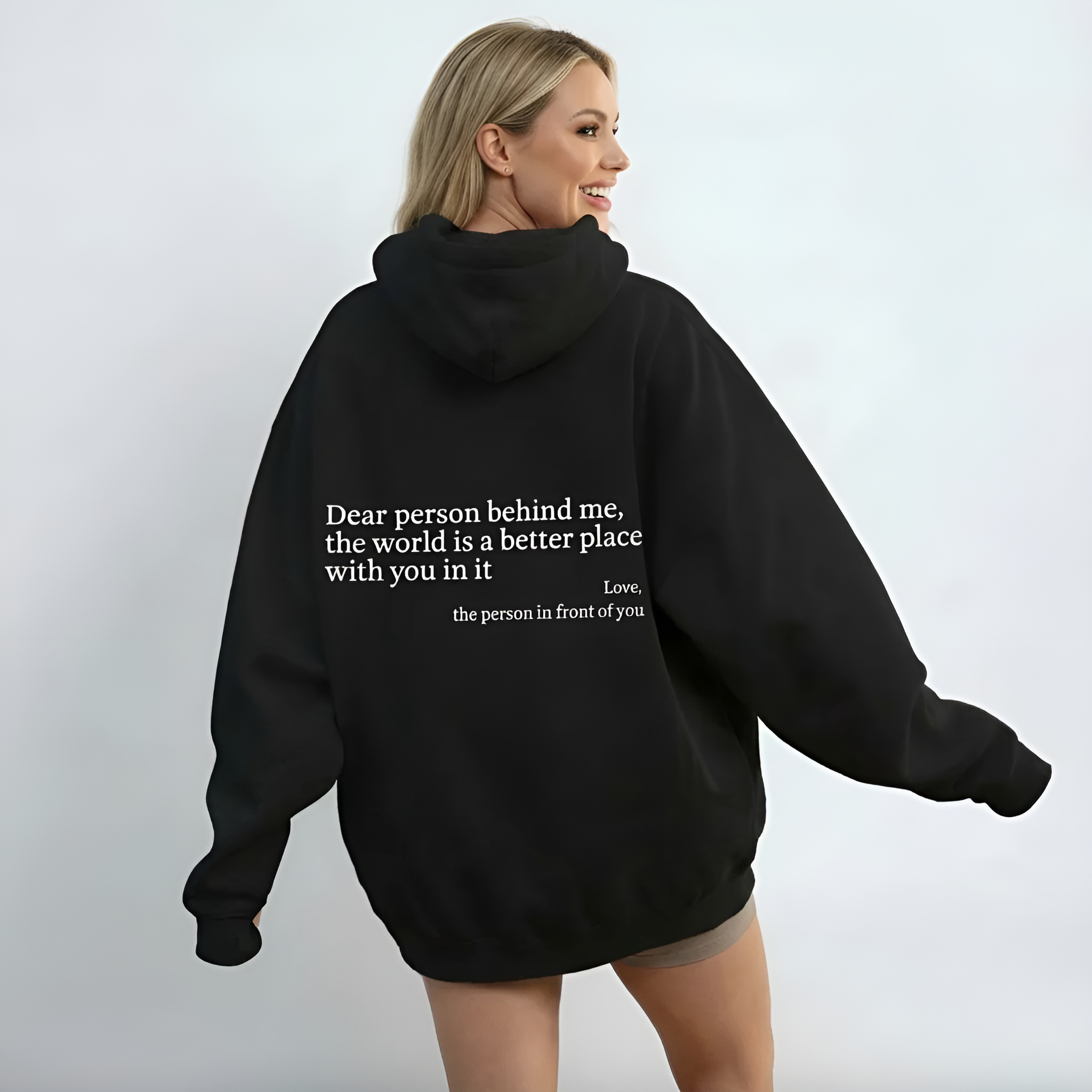 "Wore my new hoodie today that says “Dear person behind me, the world is a better place with you in it.” At the grocery store, a woman actually tapped me on the shoulder with tears in her eyes and said she needed that message today more than ever. 🥺