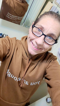 "Very anxious and excited to receive my hoodie. Perfect fit! Wore it to the pharmacy and grocery store the first day and had a few acknowledgements. I wore it yesterday to my granddaughters therapy appointment at our local mental health center. I had a client comment on the power of the message and stated how wonderful it would be to have more kindness in this world. Such a great feeling to know that you can make an impact with such a small gesture of affirmation."